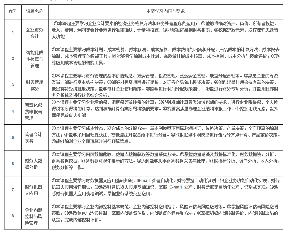 本专业培养理想信念坚定,德、智、体、美、劳全面发展,适应京津冀区域经济发展和企业智能化转型需要,掌握扎实的科学文化基础和财务管理基本理论及相关经济、会计、税务、管理等知识,具备会计核算、成本核算与管理、项目投资管理、筹资管理、大数据工具分析应用、内部控制与风险管理等能力,具有工匠精神和信息素养,具有中华优秀传统文化等良好的科学素养与人文素养,面向各类中小微企业从事会计核算、财务大数据分析、预算管理、投融资管理、成本管理、绩效管理等工作的数字化、智能化高素质技术技能人才。