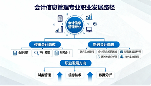 会计信息管理专业旨在培养既懂会计核算又掌握信息管理技术的复合型人才,既可担任传统会计职业岗位,如会计核算、审计助理等岗位,也可以适应新兴岗位的需求,如ERP实施顾问、会计信息系统运维、财务数据分析师、RPA实施顾问等岗位。