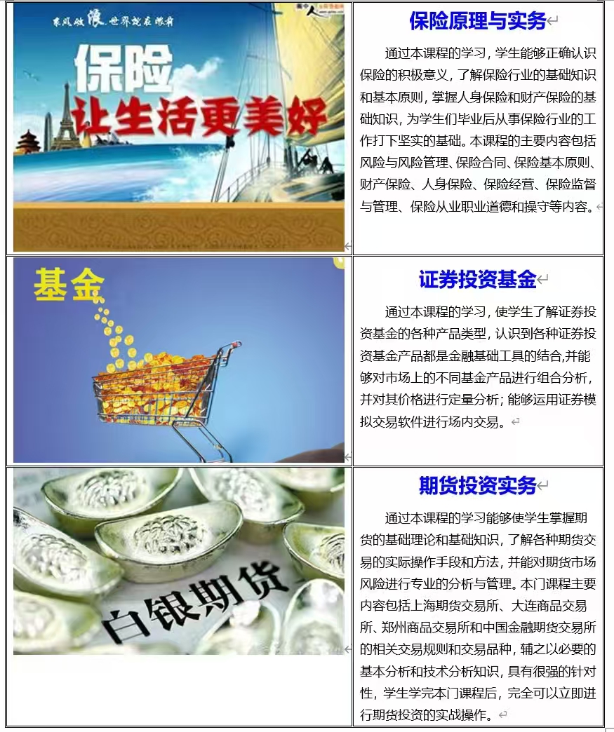 金融服务与管理专业已与多家金融机构签订校企就业合作协议,有效保证了学生专业技能的实习实训。如北京指南针投顾、河北源达投顾、招商证券、北京天相财富等。