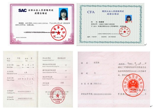 证券从业资格证书、期货从业资格证书、基金从业资格证书、银行从业资格证书等。