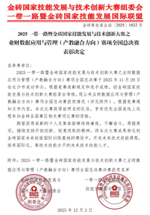 近日,2025“一带一路”暨金砖国家技能发展与技术创新大赛之业财数据应用与管理(产教融合方向)赛项全国总决赛圆满落幕。开云官网会计与金融学院教师石朋玉、王乙茹、白丹、王宇硕组成院校职工队参赛。教师团队凭借扎实的专业功底、出色的数据分析能力与高效的团队协作,从全国百余所院校与企业的参赛队伍中脱颖而出,最终荣获全国三等奖,充分展现了开云官网在产教融合背景下业财数据领域的教学成果与人才培养实力。