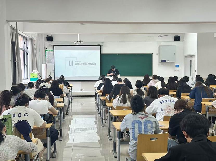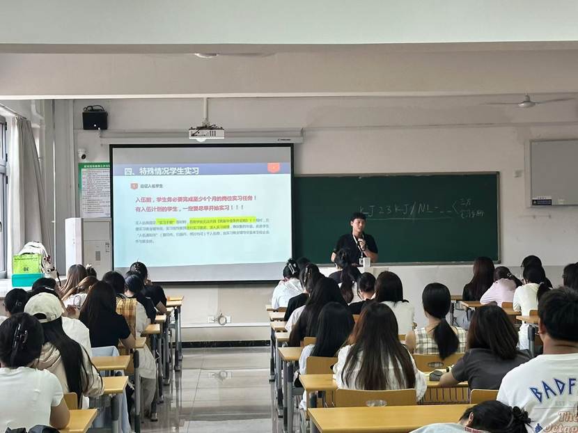 班会现场,张宇康老师围绕实习流程、特殊情况学生实习安排等核心内容展开讲解。在介绍课程及特殊情况学生实习板块时,他详细阐释不同情形下实习要求,让有特殊情况的同学明晰自身任务;谈及入伍前学生实习,着重强调 “入伍前,学生务必需完成至少6个月的岗位实习任务” ,提醒有入伍计划的同学尽早规划实习,确保学业与职业发展有序推进,让同学们轻松掌握操作要点,消除申请过程中的迷茫。