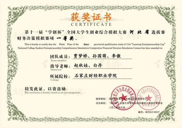 2024第十一届“学创杯”全国大学生创业综合模拟大赛省(区)级选拔赛(财务决策模拟赛项)一等奖