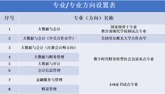 现形成了以大数据与会计专业为核心,大数据与财务管理、大数据与审计专业为两翼,会计信息管理、金融服务与管理、财富管理为特色,适应学生专业技能提升和满足京津冀区域经济需求的财会金融类专业设置格局。