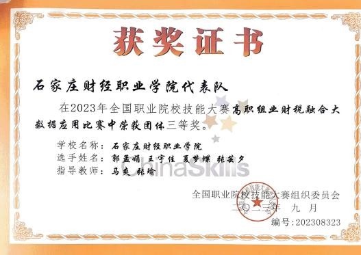 全国职业院校技能大赛业财税融合大数据应用三等奖