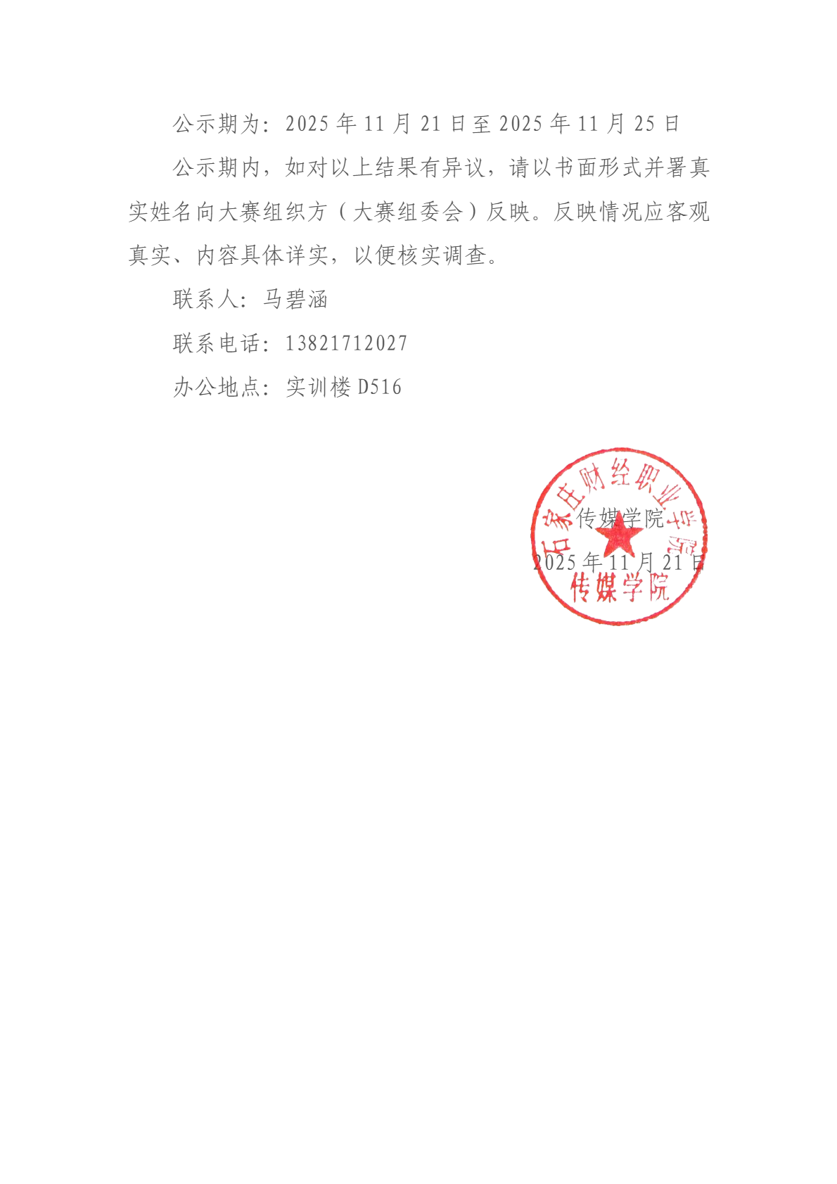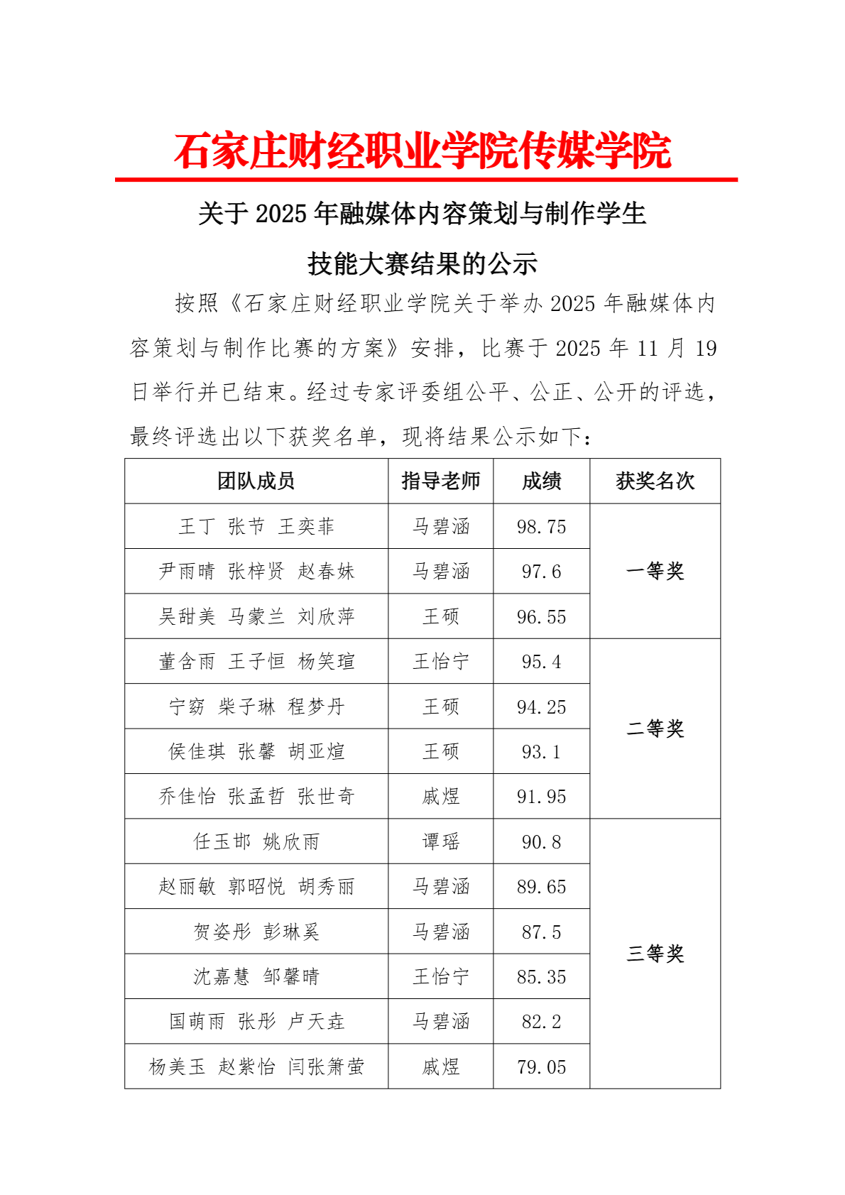 关于公布2025年融媒体内容策划与制作学生技能大赛结果的公示