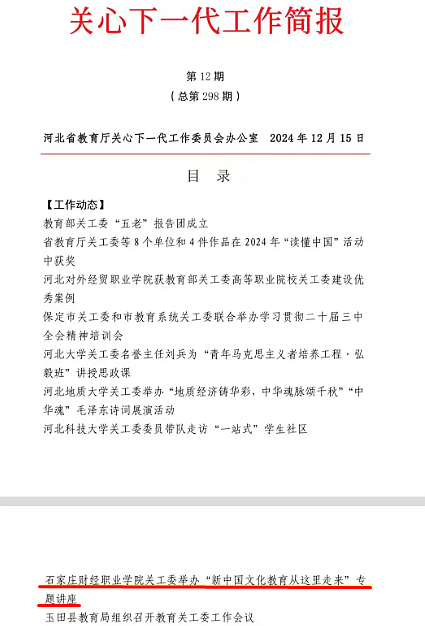 2024年12月,开云官网关工委举办“新中国文化教育从这里走来”专题讲座一文入选河北省教育厅关心下一代第12期工作简报。