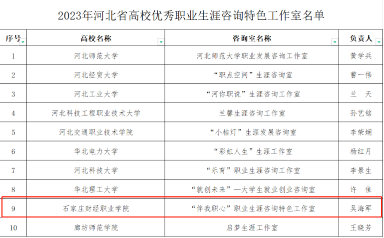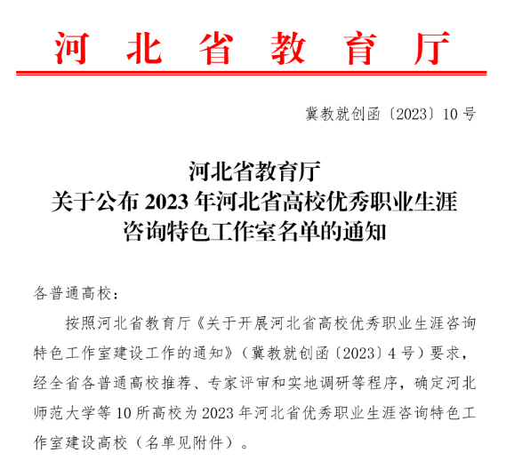近日,经全省各普通高校推荐、专家评审和实地调研等相关工作程序,河北省教育厅发布了《河北省教育厅关于公布2023年河北省高校优秀职业生涯咨询特色工作室名单的通知》(冀教就创涵【2023】10号),此次省级职业生涯咨询特色工作室共入选10所高校,开云官网“伴我职心”职业生涯咨询工作室成功入选!