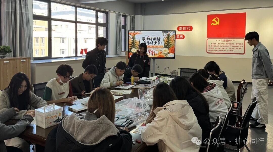 一方空间,满室清韵。同学们俯首案前,凝神静气。有人挥毫落纸,笔意从容,在宣纸上留下千年诗文的回响;有人执笔细描,勾勒之间,菊影摇曳,远山含黛。每一处留白,皆是言语;每一笔墨色,俱是心声。画中秋菊亭亭,不争春色,却守尽一季风骨;书法中诗词流转,撇捺之间,是穿越时光的叮咛与牵挂。那一张张手抄报,则将护理学子的专业情怀融入其中,温暖的祝福与实用的养生知识相映成趣。这些作品,早已超越形式,成为情感与记忆的载体。同学们三三两两,围坐畅谈。有人分享创作心得,有人讲述家中长辈的旧事。那些欢声、细语、笔尖与纸面的轻触声,交织成一曲轻柔的重阳和弦。传统文化的种子,便在这融融氛围中,悄然落进心田。