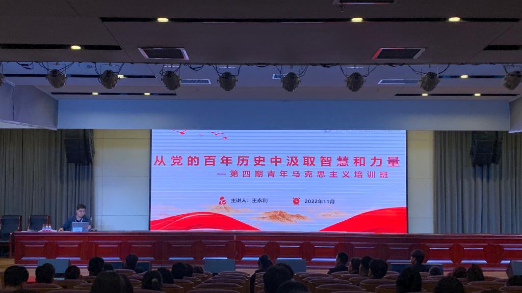 开班仪式结束后王永利以“从党的百年奋斗重大成就和历史经验中汲取智慧力量”为主题,开启本期“青马培训”第一讲。他用生动的语言、通俗易懂的历史故事讲解指导“青马班”学员要从党的百年奋斗史中感悟真理的力量,不断深化对中国共产党执政规律、社会主义建设规律的认识,用马克思主义的真理光芒照耀我们的前行之路,并鼓励同学们要牢记习近平总书记的期望,坚定不移听党话、跟党走,希望大家都能有信仰、立宏志、善学习、勤实践,让青春在奋斗中绽放光彩。他精彩的讲座为大家进一步提升理论素养、学习贯彻党的二十大精神提供了指导。