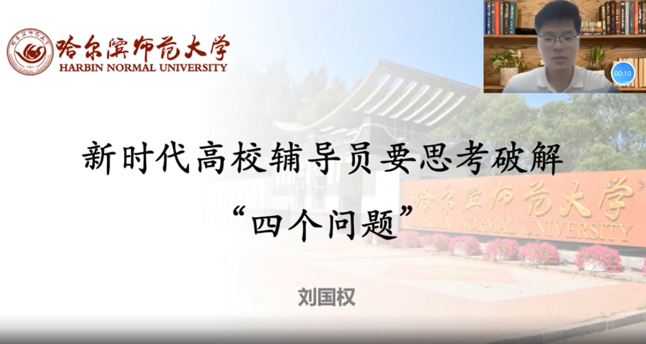 哈尔滨师范大学马克思主义学院讲师、2021年全国最美高校辅导员辅导员刘国权老师在《新时代高校辅导员要思考破解“四个问题”》中给我们做了详细的解答。他讲到,高校辅导员要找准人生导师和知心朋友的定位,加强学生思想教育和日常事务的融合,确保个人进步要和学生成长的同步,提升青春个性与青年担当的认识。他分享了自己多年从事一线辅导员工作的心得体会,强调面对繁杂的学生工作要做到工作有温度、有方法。建议辅导员老师们要在工作中找准重点,根据学生特点和成长需求,深入探索新的工作思路和方式方法。