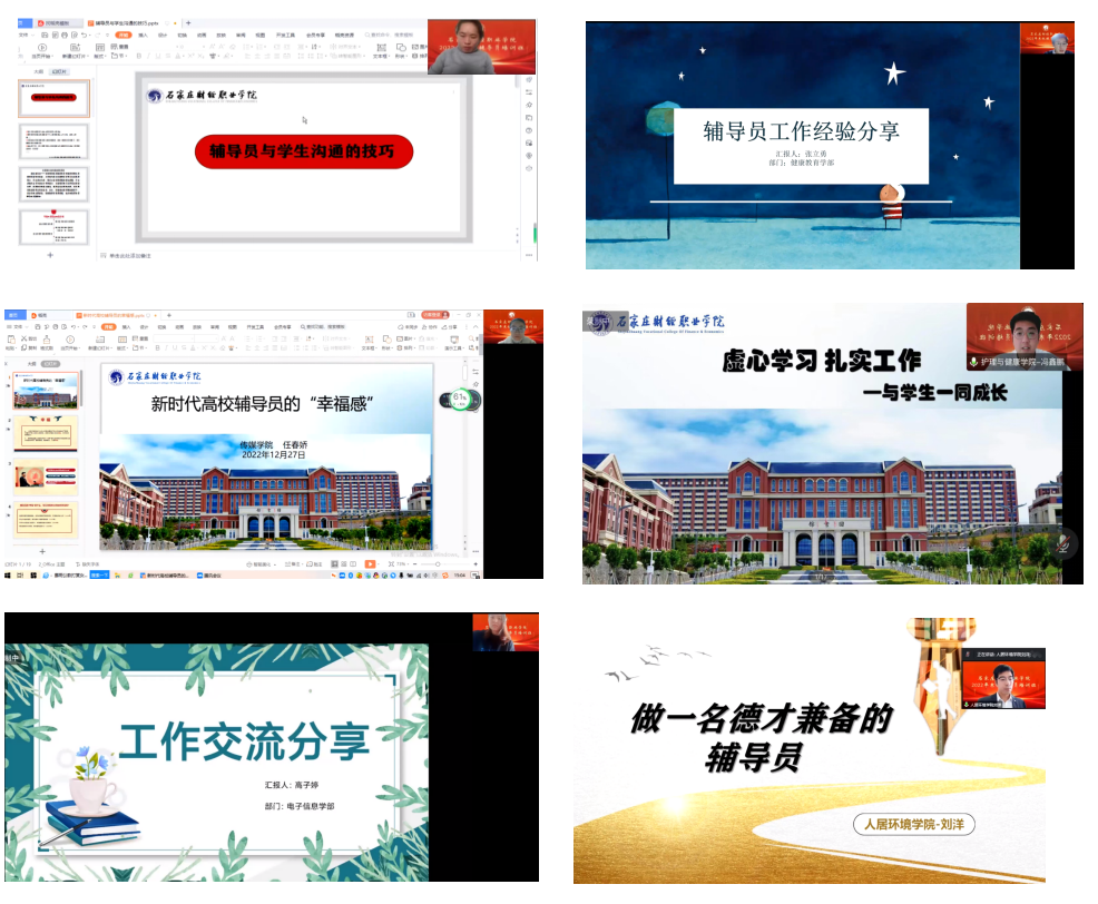 最后的经验分享交流环节中,学前教育与艺术教育学院党总支书记郝艳在、健康教育学部党总支副书记张立勇、传媒学院党总支副书记任春娇、护理与健康学院辅导员冯鑫鹏、电子信息学部辅导员高子婷、人居环境学院辅导员刘洋共6位老师进行工作经验级分享。各位老师纷纷将自己在工作中遇到的情况进行阐述,并结合实际把处理问题的经验以及学生工作带来的获得感、满足感和幸福感与参训人员进行分享交流。