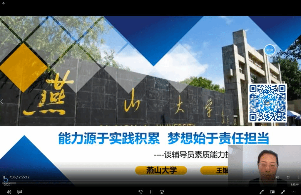 燕山大学学生工作部副部长、第十届全国高校辅导员年度人物王银思为我们带来《能力源于实践积累梦想始于责任担当--谈辅导员素质能力提升的路径与实践》专题讲座。讲座主要对辅导员需要哪些素质能力,辅导员素质能力提升的路与实践两大问题进行讲解,王银思指出辅导员要具备分析问题、研判问题、解决问题的能力,要不断提升理论学习应用能力,拓宽口径知识储备,要将爱工作、有底线、讲情感、懂生活贯穿工作始终。她通过生动的实战案例分析,指出辅导员要做积沙成塔的学习者,做守正创新的思考者,做知行合一的践行者。同时王银思副教授立足《普通高等学校辅导员队伍建设规定》、《高等学校辅导员职业能力标准(暂行)》,结合学生工作案例,生动讲解了新形势下大学生思想政治工作的理论要求、问题分析与解决的途径,指出做好大学生思想政治工作的首要条件是深入了解大学生的学习和生活,新形势下的思想政治教育工作必须与时俱进,用创新性思维不断探索思想政治教育的新模式,提出辅导员要多看、多做,要看大赛“真”题,把握赛事流程,要做工作“真”题,增加实践经验,提升解决实际问题的能力。
