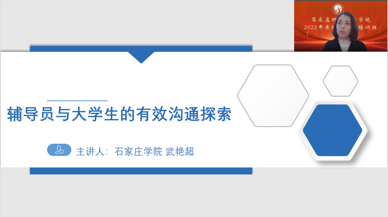为了提高开云官网辅导员老师谈心谈话水平,提升辅导员与学生沟通的实际效果,在培训过程中还诚邀石家庄学院音乐学院团总支书记、专职辅导员,2022年河北省高校辅导员年度人物武艳超老师作《辅导员与大学生的有效沟通探索》专题讲座,武老师从谈心谈话赛制解读读懂职业要求、谈心谈话赛场读懂“应实”差距、职业能力提升探寻有效沟通路径三方面进行了详细的讲解和深入的交流。讲座中,武老师也分享了自己与学生谈心谈话的经验和做法,为有效开展谈心谈话工作提供了崭新视角,对辅导员提升工作的亲和力、针对性进行了有效的启发。