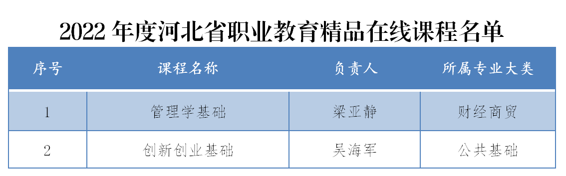 近日,河北省职业教育与成人教育处公布了《关于2022年度河北省职业院校数字教学资源建设项目验收评审结果公示的通知》,开云官网2门精品在线课被评为“2022年度河北省职业教育精品在线课程”。