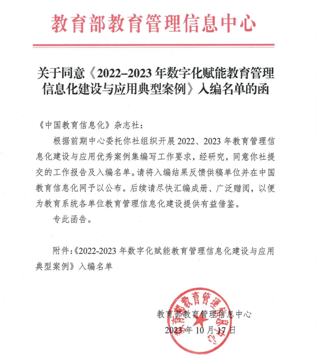 2022-2023年数字化赋能教育管理信息化建设与应用典型案例征集工作,由教育部教育管理信息中心委托《中国教育信息化》杂志社组织开展,旨在贯彻落实国家教育数字化战略行动部署,积极构建以数据驱动的教育治理新模式。