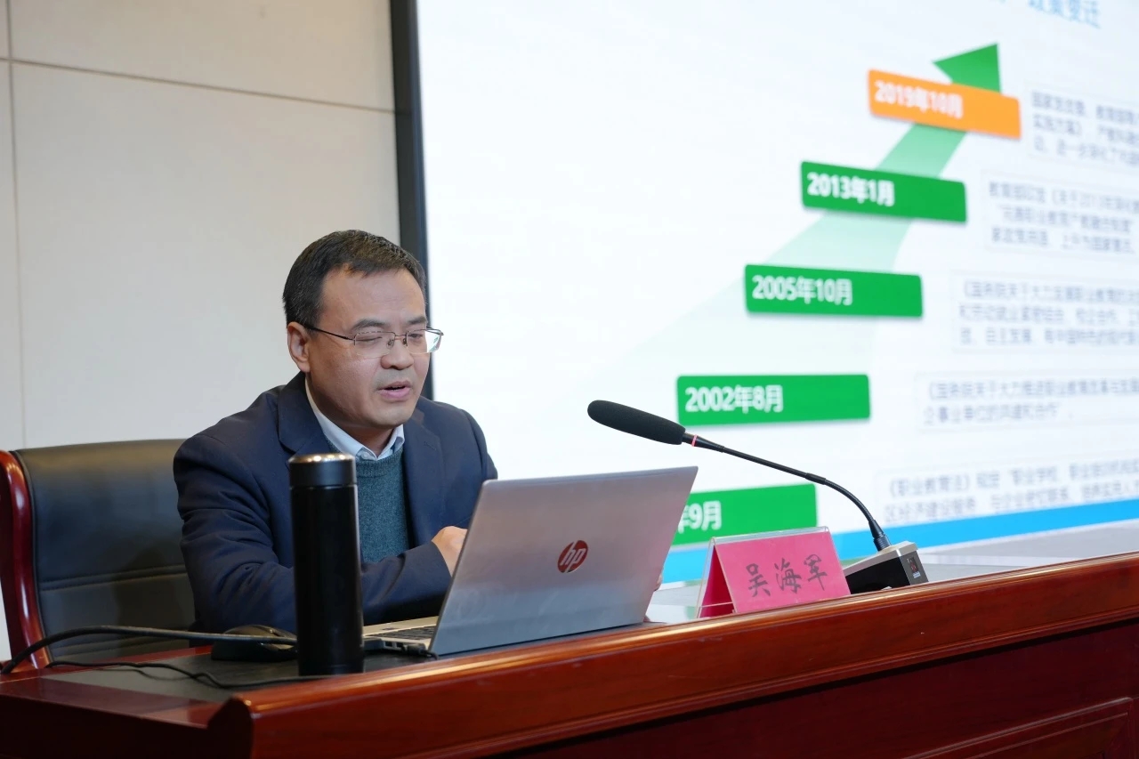 1月9日上午举行了“第三轮创新发展行动计划启动仪式”。随后,学校校企合作与就业处处长吴海军就教育部办公厅关于加快推进现代职业教育体系建设改革的重点任务进行解读,分别从重点任务出台背景、重点任务的内容、重点任务建设意义三个方面,围绕加快现代职业教育体系建设改革,构建、建设现代职业教育体系,对11项重点任务进行详细解读,结合学校的实际情况,对学校构建职教体系出具体做法和建议。