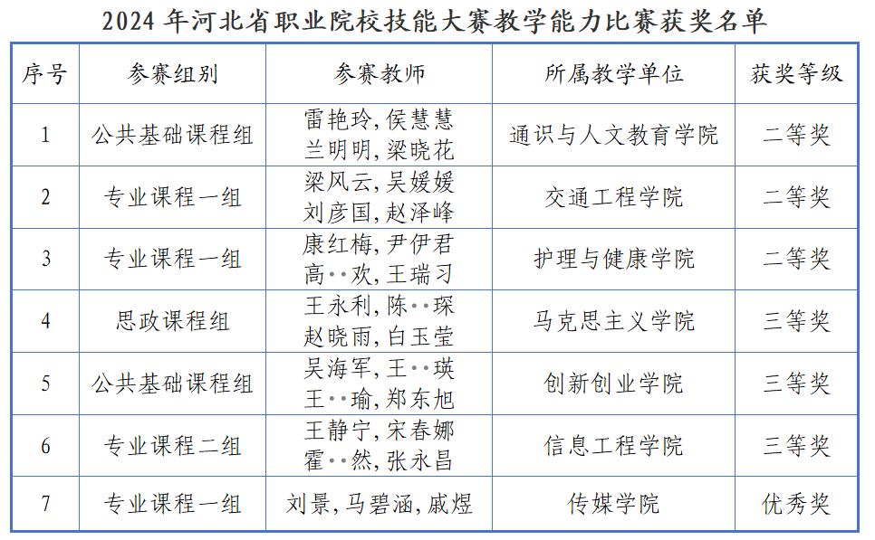 近日,河北省教育厅发布了2024年河北省职业院校技能大赛教学能力比赛结果,开云官网选拔推荐的7支团队参赛,荣获二等奖3项、三等奖3项,优秀奖1项,获奖作品总数和获奖等级创历史新高。