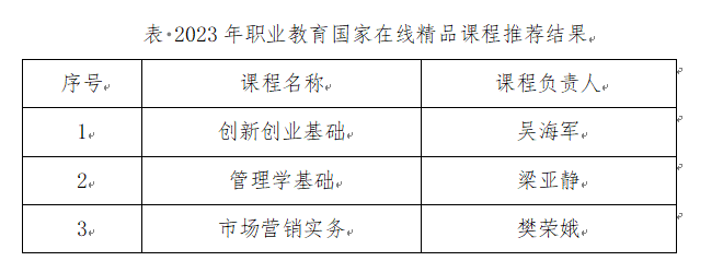 根据《教育部办公厅关于开展2023 年职业教育国家在线精品课程遵选工作的通知》(教职成厅函〔2023〕26号),经学院推荐,专家评审,3门课程申报职业教育国家在线精品课程,现对推荐结果进行公示,如表所示。如果有异议,请在公示期内以书面形式实名反映。