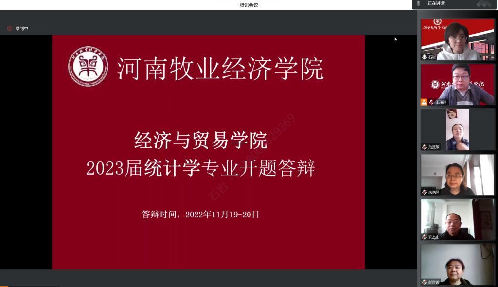 根据《河南牧业经济学院本科毕业论文(设计)工作条例》和《BEAT365英国官网统计学专业2023届本科毕业论文工作实施方案》的要求,BEAT3652023届统计学本科专业毕业论文开题答辩工作,于11月19日通过腾讯会议线上顺利进行,8位老师和57名同学参加了开题答辩。