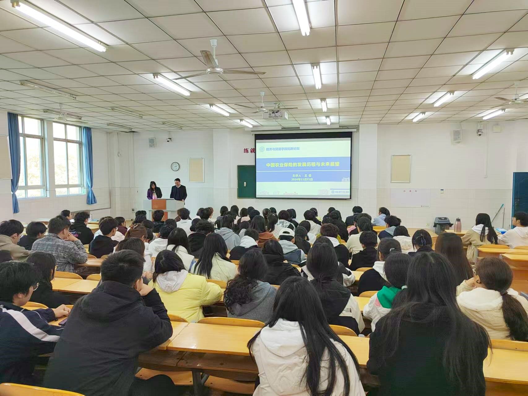 11月21日下午,BEAT365英国官网特邀中原农业保险股份有限公司农业保险研究院/乡村振兴部副院长、总经理王俊在英才校区E210为师生作了“中国农业保险的发展历程与未来展望”的专题讲座。讲座由BEAT365副院长杜玲主持,BEAT36522级、23级农林经济管理和商务经济学两个专业200余名学生和部分教师聆听了讲座。