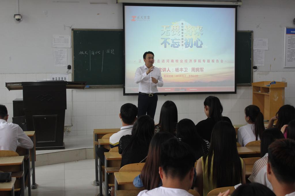 讲座首先以一段励志短片开始,激励学生如果想要成功,一定要有梦想,有目标,有信心,有好的导师;还告诉大家人生如果不尝试,就永远不知道自己有多大的潜能。随后,两位高管分别讲述了自己传奇的创业奋斗历程,区域总监杨丰卫先生讲述了自己从最初进入职场的不善言辞到如今管理正天置业几十家分店的动人故事;后勤总监周拥军先生通过若干真实案例说明了坚持梦想、不懈努力才能在市场起伏不定的大潮中积累本领、收获成功。最后,两位高管还与同学们进行了亲切互动,对同学们提出的各种问题进行了耐心详细的解答。