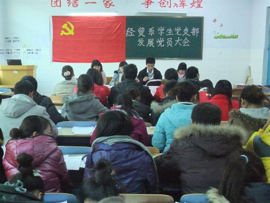和25日下午2点30经济贸易系第二学生党支部在B211教室迎来了本支部接收预备党员及预备党员转正大会。对于参会的77位同学来说非常神圣时刻到来了! 恭听了振奋的国际歌后,大会首先由支部书记宣布大会流程,严格按照党章流程进行,先是由发展预备的学生依次进行个人的汇报,激情满怀地宣读了入党志愿书,表达了坚定的入党决心和对党的深刻认识,以及一年来自己各方面的进步。然后由组织委员和党小组组长分别介绍其一年来的考察情况供支部各成员参考,最后支部大会讨论并举手表决,结果一致通过48位学生成为党组织的新鲜血液。 接着,预备党员杨雪等29位同志依据转正申请书谈了预备期间的感想,并表达了转正决心,主要介绍自己在预备期一年里的思想转变的情况,然后由所有正式党员举手表决并顺利通过。 最后,被接受为预备党员的学生和转为正式党员的学生面对党旗进行宣誓。党组织对新成员的加入表示了热烈的祝贺,并对其提出了要求和希望。 此次会议有序计划,顺利进行,圆满成功!