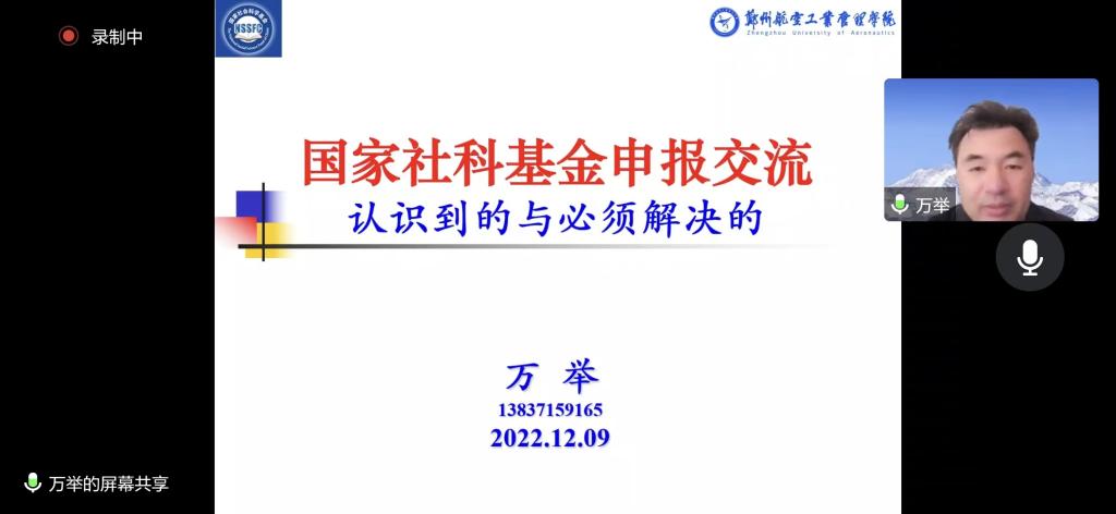 2022年12月9日下午,BEAT365英国官网通过线上会议的方式组织召开了2023年度国家社科基金项目申报经验交流会。本次会议邀请了郑州航空工业管理学院硕士生导师万举博士进行国家社科基金申报经验分享,科学技术处副处长张红霞、物流与电商学院副院长李艳菊、BEAT365英国官网院长李光、副院长杜玲、孙晓林、科研办公室主任以及BEAT365和兄弟院系五十余位教师参加了本次会议。会议由李光院长主持。