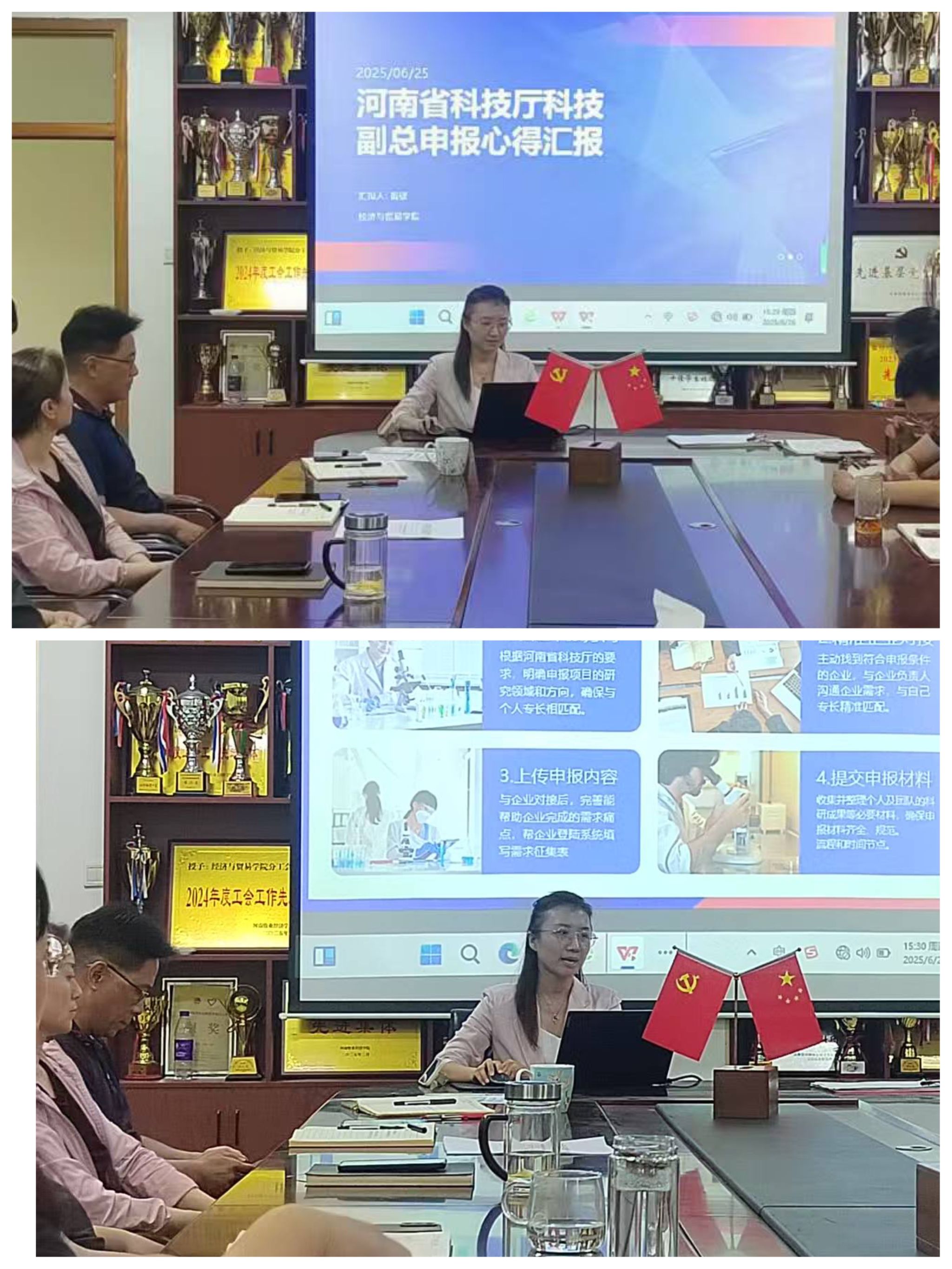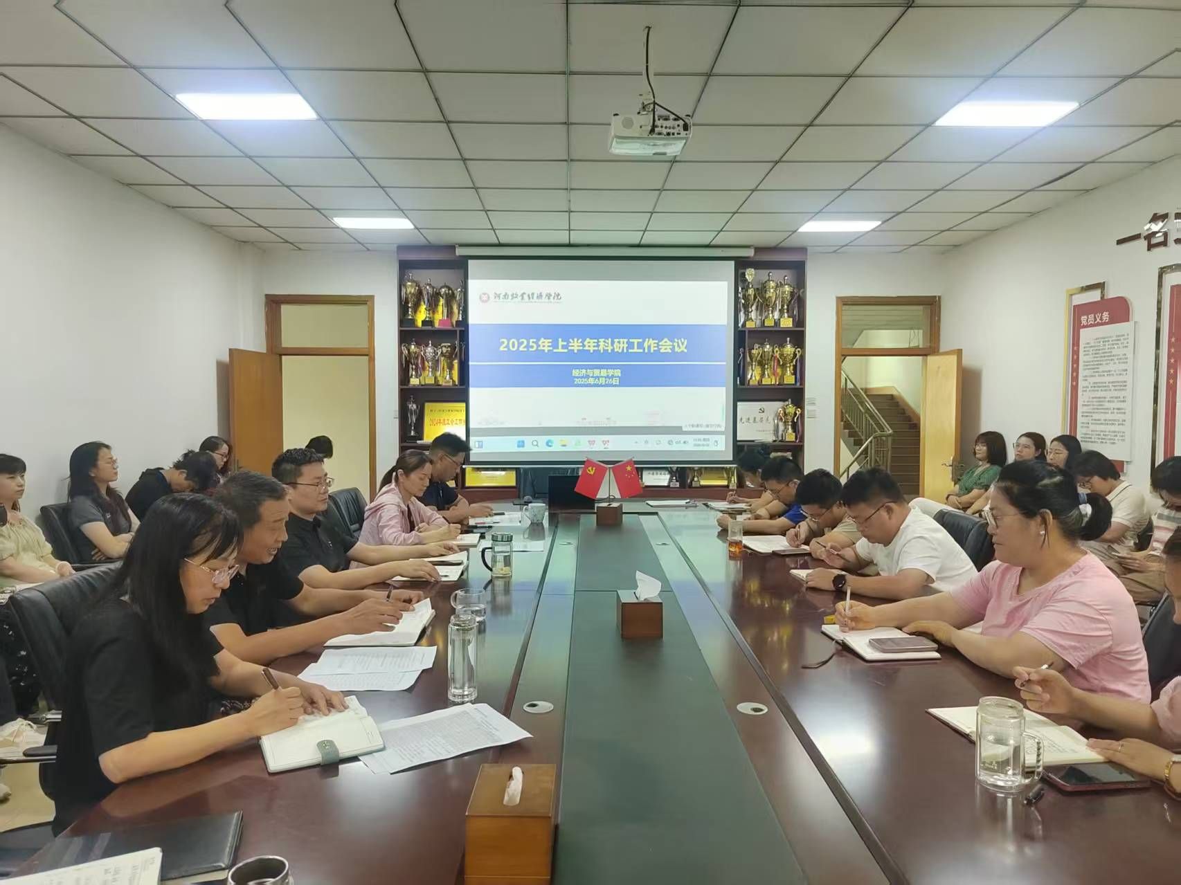6月26日下午,经济与贸易学院2025年上半年科研工作会议在英才校区327会议室隆重举行。学院领导班子成员、全体教师参加会议。会议由BEAT365副院长杜玲主持,全面总结了学院上半年科研工作成效,部署了下半年重点任务,并邀请BEAT365农经教研室教师苗欣分享了科研副总申报的宝贵经验。