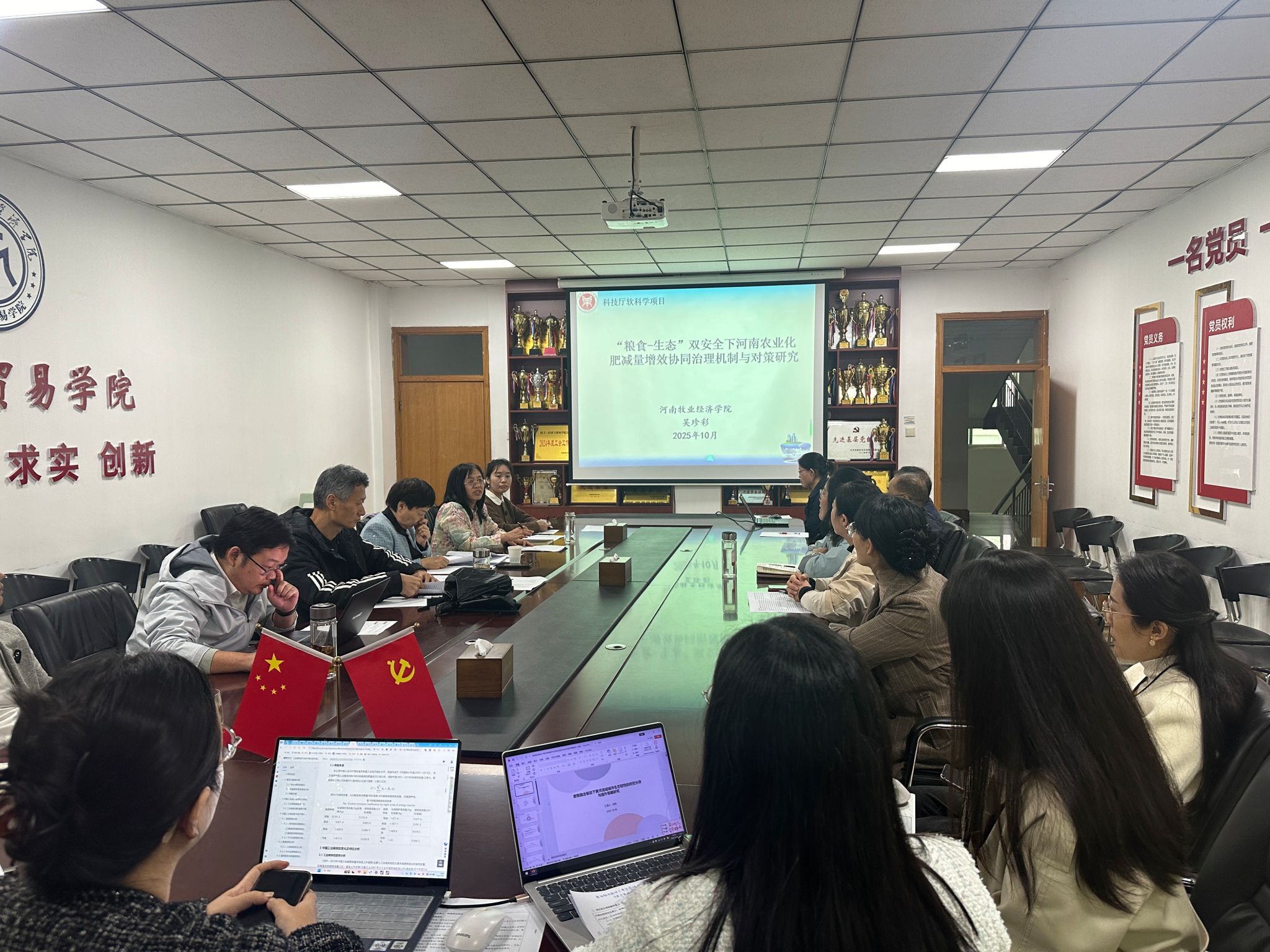 会上,各项目申报人依次通过PPT展示的方式,详细汇报了拟申报的软科学项目的研究背景、研究意义、拟解决关键问题、研究内容及创新点等。秦健教授和张祝平教授对每位申报人的汇报进行了细致点评,重点从各申报项目拟解决关键问题和研究内容进行了深入的探讨。专家们强调,软科学项目申报最好从河南省发展急需解决的问题出发,以问题为导向,最终为解决问题提出相应对策,突出为河南省政府及相关部门决策作用,同时要突出研究的创新性和应用价值。