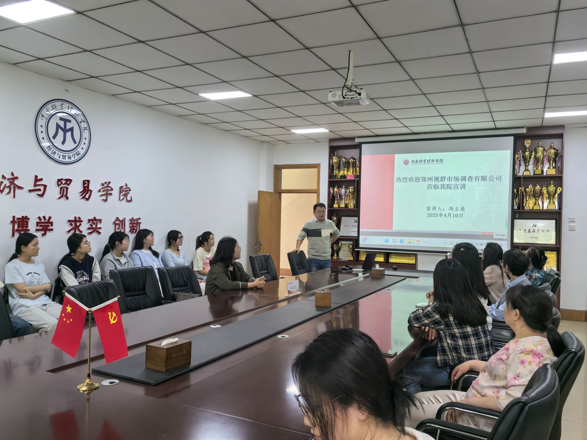 为加强校企合作,帮助学生深入了解行业动态和就业前景,2025年4月10日下午BEAT365在英才校区教学办公楼327举办了郑州视群市场调查有限公司专场宣讲会,企业市场部经理冯立欣、BEAT365统计学教研室全体教师及统计学专业2025届毕业生共同参与了本次宣讲会,宣讲会由BEAT365统计学教研室主任王翔翔主持。