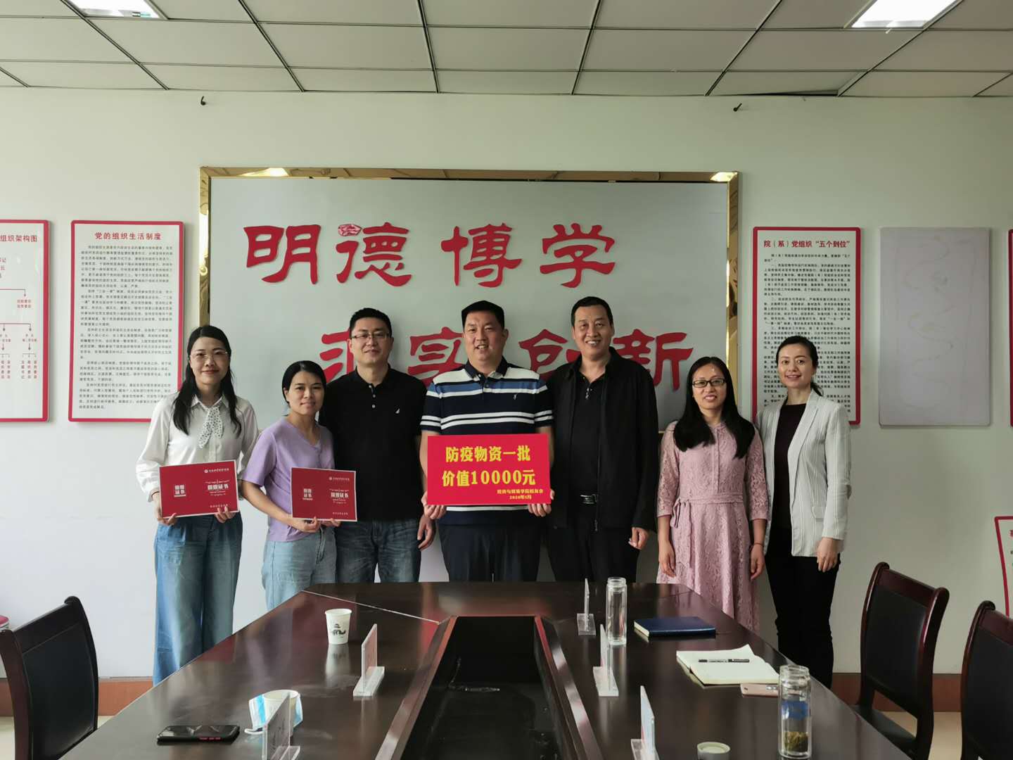 捐赠仪式上,学院校友代表楚广军、宋晓霞、高君利向学院定向捐赠价值10000元的防疫物资,李光院长代表学院接收了捐赠,张松刚书记向校友们颁发了捐赠证书。