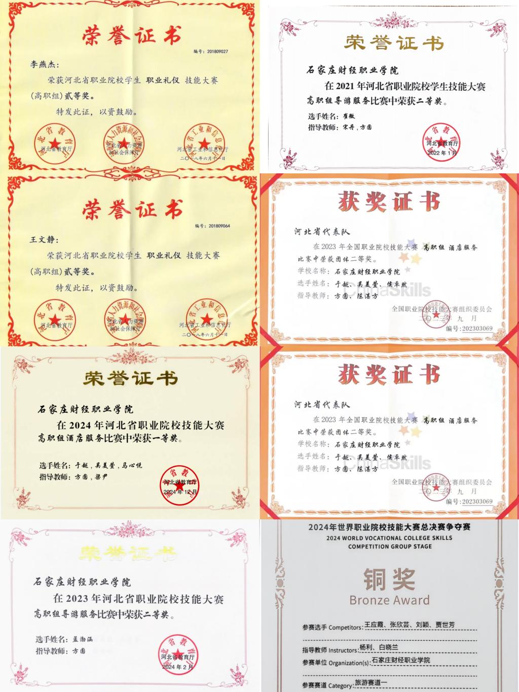 承办2021年河北省职业院校导游服务项目比赛,2023-2025年河北省职业院校酒店服务项目比赛。近几年,组织学生参加各类比赛,荣获2018年河北省职业院校职业礼仪技能大赛二等奖,2020年河北省职业院校技能大赛餐厅服务赛项三等奖、2021年河北省职业院校技能大赛导游服务赛项二等奖、三等奖,2023年河北省职业院校技能大赛导游服务赛项二等奖、三等奖,2023年河北省职业院校技能大赛酒店服务服务赛项一等奖、二等奖,2023年全国职业院校技能大赛酒店服务赛项二等奖。2024年河北省职业院校技能大赛酒店服务赛项一等奖,酒水服务赛项二等奖,导游服务三等奖。2024年世界职业院校技能大赛酒水服务赛项铜奖。2025年河北省职业院校技能大赛酒店服务赛项一等奖,酒水服务赛项二等奖。