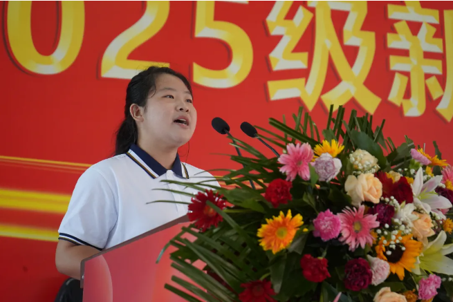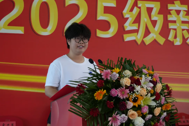 2025级旅游服务与管理专业的新生高畅代表新生发言。她表达了对校园生活的无限憧憬与期待,并表示将牢记师长嘱托,尽快转变角色,以饱满的热情投入到新的学习和生活中。作为新一代财经学子将以“技能为舟、高考为帆”,在学校的沃土上,以汗水为墨,以奋斗为笔,写下无愧于青春、无愧于时代的“出彩分录”!