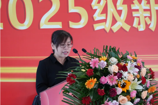 文理学院院长段国翠代表教师发言。她表示,文理学院拥有一支充满爱心、责任心和专业素养的教师队伍,他们会用无限的耐心,陪伴同学们攻克学习上的难关;用温暖的关怀,倾听同学们成长中的烦恼;也将用严格的要求,引导同学们养成良好的学习习惯和职业道德,老师们将用爱与责任去守护每一位同学的梦想,促进每一位同学的全面发展与个性成长。希望同学们珍惜在校时光,不负韶华、勤奋学习、苦练技能、全面提升。文理学院全体教师将一如既往,以最大的热情和全部的智慧,为同学们的成长保驾护航。