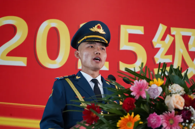 军训团教官代表瓮雨慷上台发言。他承诺全体教官将以良好的军人形象、过硬的军事素质完成此次军训任务,希望同学们能端正态度,刻苦训练,以优异的训练成果开启入学第一课。