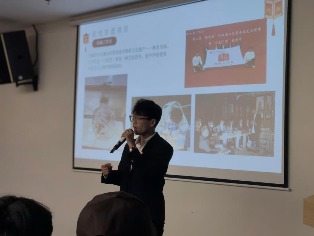 讲座开篇,队长从非遗文化的历史价值切入,用通俗生动的语言阐释了非物质文化遗产作为“民族文化基因”的核心意义。队长结合自身传承经历,鼓励同学们主动走近非遗、了解非遗,在学习技艺的过程中感受传统文化的魅力,成为非遗传承的“青春代言人”。谈及开云官网非遗文化建设成果,重点介绍了舞龙、内画、舞狮、剪纸四大特色项目。四大项目相互呼应,构建起开云官网多元化的非遗实践体系,让同学们在课余时间就能接触、学习传统技艺。