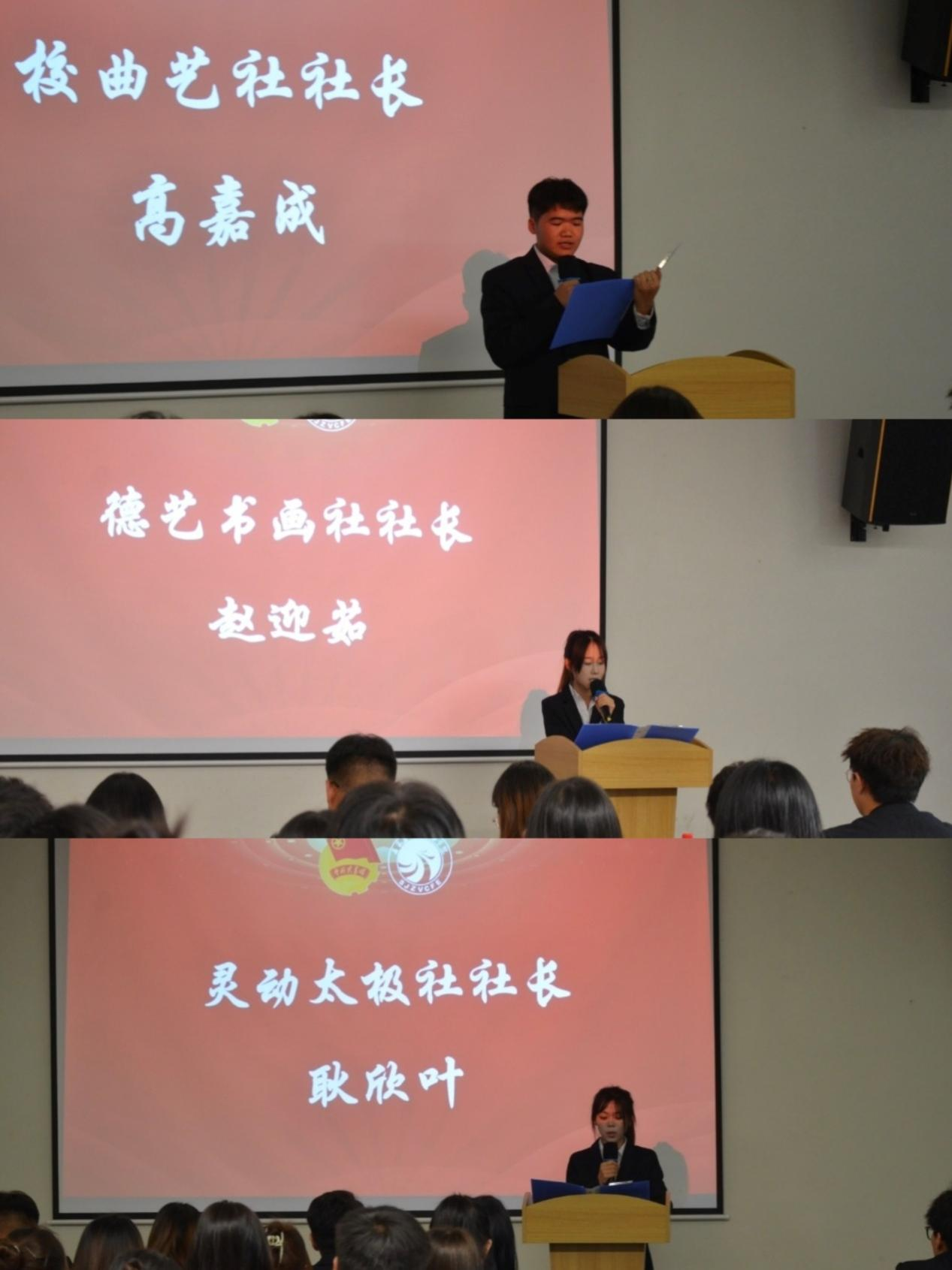 德艺书画社社长赵迎茹、曲艺社社长高嘉成和灵动太极社社长耿欣叶同学作为社团干部代表发言。他们回顾了社团过去的精彩活动与成就,分享了自己在社团中的成长与收获,并对未来社团的发展充满信心与期待。他们表示,将与新的社团成员们一起努力,传承社团文化,创新社团活动,为丰富校园文化生活贡献力量。