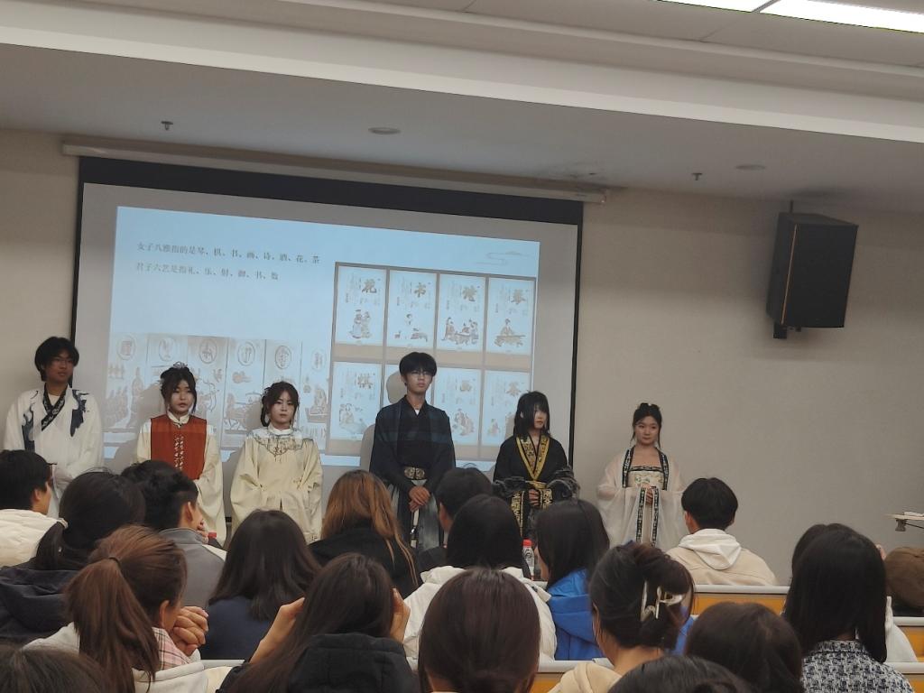 除了理论知识的讲解,活动还设置了互动环节。同学们积极参与汉服知识问答,现场气氛热烈。答对问题的同学获得了精美礼物作为奖励,这不仅增加了活动的趣味性,也进一步加深了大家对汉服文化的理解和记忆。
