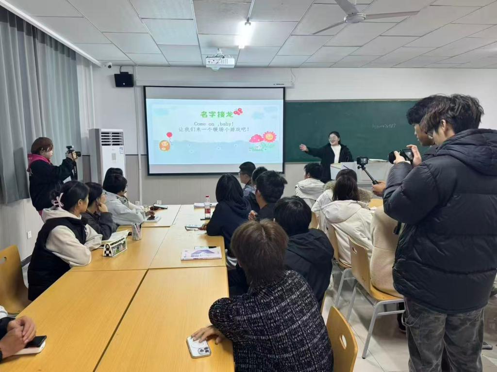 “名字接龙”环节,同学们依英语规范自我介绍并复述前一人关键信息,强化口语输出与短时记忆;