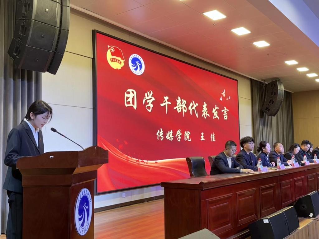 随后,来自传媒学院的院级团学代表王佳进行了发言。她从“实干”与“担当”两个维度,讲述了自己在团学岗位上的实践感悟,提出团学干部要始终站在同学中间,倾听需求、解决问题,并表示将把培训所学转化为实际行动,切实发挥桥梁纽带作用。