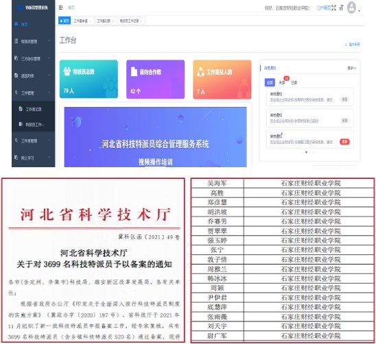两年来,学校一直坚持走科技创新之路,根据省科技厅及市科技局相关要求,多次组织开展科技特派员申报工作。截至目前,省级科技特派员综合管理系统中已备案省级科技特派员79人,备案市级科技特派员68名,市级科技特派团队4个;2022年省级科技特派员驻派企业15人,驻派企业科技特派员团队1个。通过驻派服务,提升了教师科技服务水平,开辟了产学研新途径。