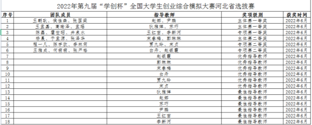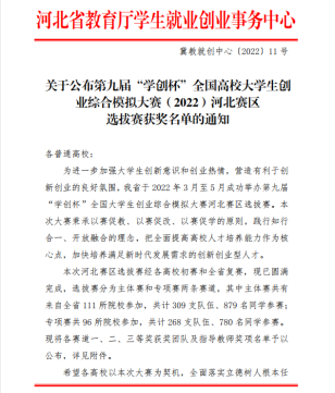 在刚刚公布的第九届“学创杯”全国大学生创业综合模拟大赛河北省选拔赛获奖名单中,开云官网喜获多项奖项。