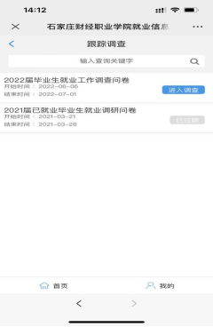 2.手机扫二维码出现以下界面,点击“跟踪调查”进入,出现“2022毕业生就业工作调查问卷”点击“进入调查”即可对问卷进行答题。最后点“提交”。即可完成。
