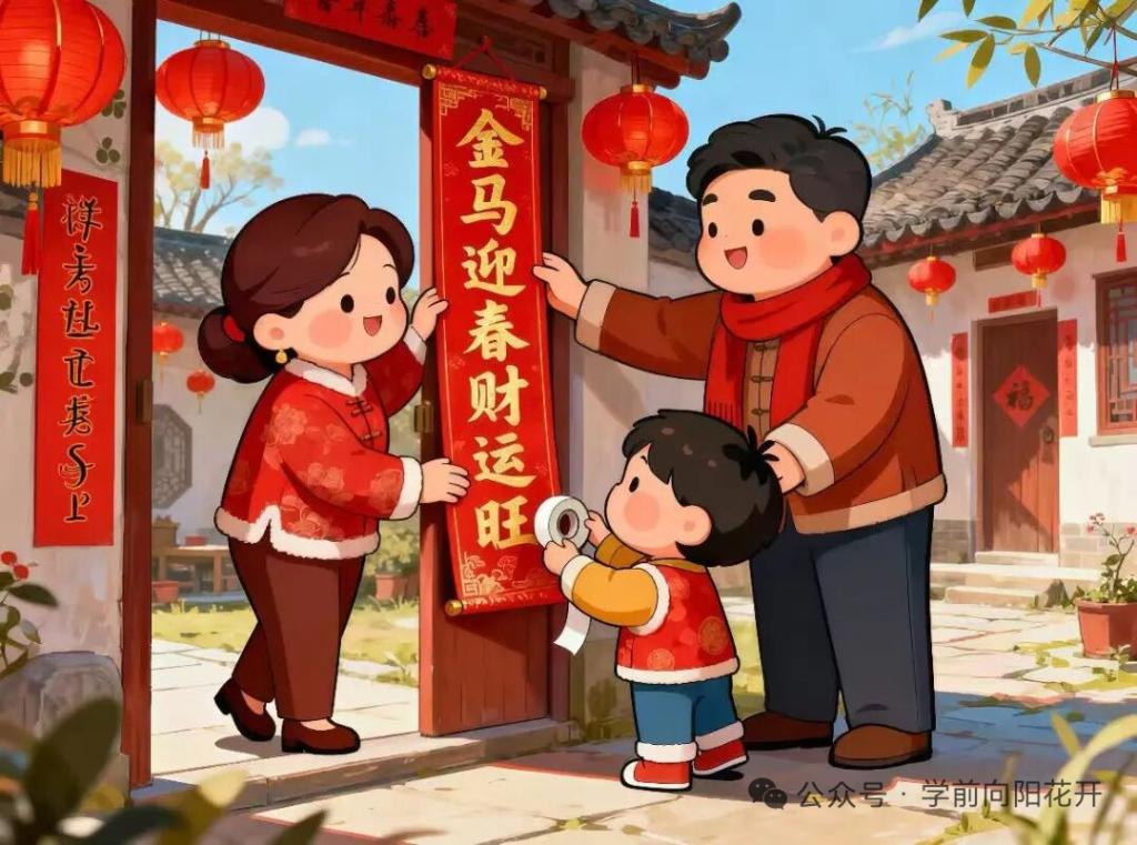 需包含春联内容及张贴过程,展现与家人共迎新春的温暖场景,春联内容可融入“骏马”“奔腾”“捷报”等马年意象