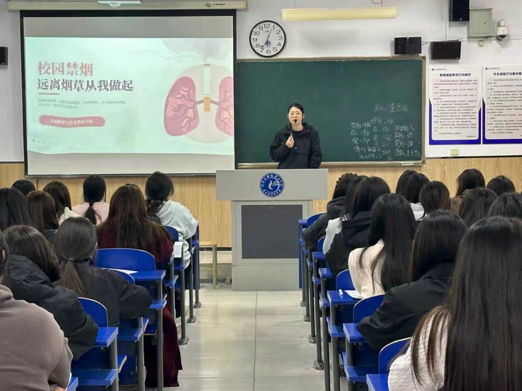 同时,辅导员重点戳穿电子烟 “无害化” 的宣传谎言,强调电子烟不仅尼古丁含量可能高于传统烟草,其添加的未知香料还具有细胞毒性,易致敏并损伤呼吸道。结合学校无烟校园建设政策,辅导员详细解读了教室、宿舍等公共场所的禁烟规定,明确宿舍吸烟、乱扔烟头等行为的消防安全隐患,引导同学们自觉抵制烟草诱惑,主动参与无烟校园建设。