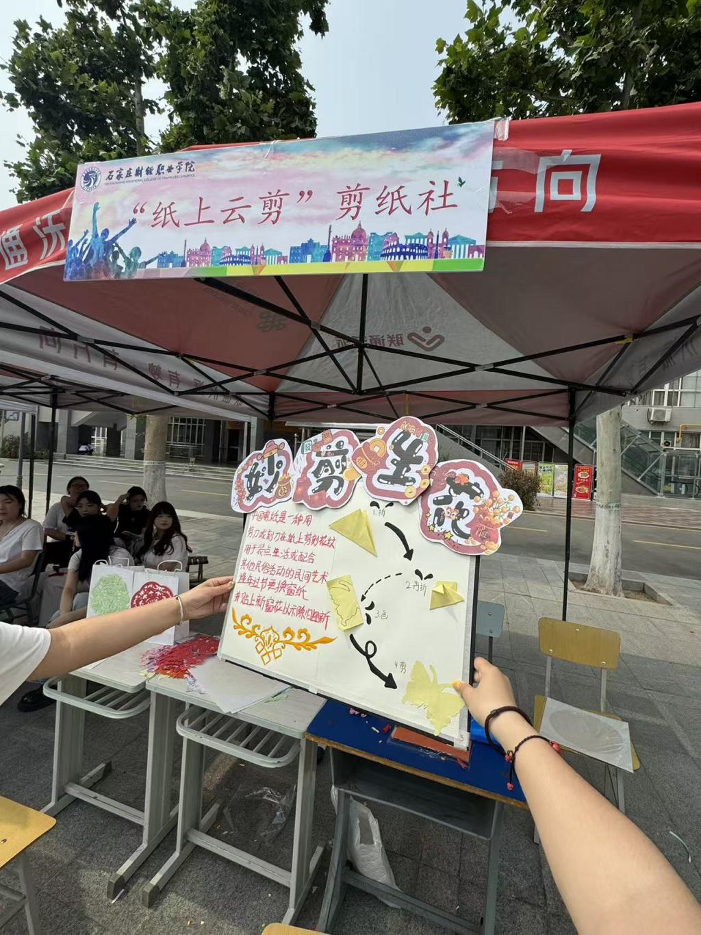 “纸上云剪” 剪纸社则将传统非遗文化带到了招新现场。社团精心布置的展台充满了艺术气息,各式各样的剪纸作品精美绝伦,从传统的窗花、福字到创意十足的现代剪纸艺术,让人目不暇接。社团成员还现场演示了剪纸的制作过程,从折纸、画图到裁剪,一步步将普通的纸张变成了精美的艺术品。他们向同学们介绍了中国剪纸的历史文化和艺术价值,让大家在感受传统艺术魅力的同时,也对剪纸技艺产生了浓厚的兴趣,不少同学现场体验了剪纸的乐趣,亲身感受非遗文化的独特韵味。