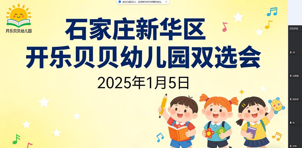 为搭建毕业生与用人单位的高效对接桥梁,助力学子精准把握就业机遇,2025年1月15日14:30-15:30学前教育与艺术教育学院联合石家庄市新华区开乐贝贝幼儿园,成功举办保育员岗位专场线上招聘宣讲会。本次宣讲采用腾讯会议线上视频形式,吸引了学院学前教育、婴幼儿托育服务与管理专业2025届毕业生积极参与,实现了企业需求与学生求职的精准匹配。