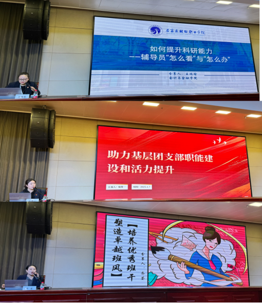 1月7日的培训聚焦辅导员核心职业能力与品牌建设。会计与金融学院王鸿瑜老师主讲《如何提升科研能力——辅导员“怎么看”与“怎么办”》,生动阐述了将日常工作转化为科研课题的路径与方法,助力辅导员突破科研瓶颈。学前教育与艺术教育学院团总支书记倪赞一老师、优秀辅导员代表经济管理学院齐荟老师则分别就“助力基层团支部职能建设和活力提升”、“培养优秀班干,塑造卓越班风”分享了宝贵的一线经验与具体做法。