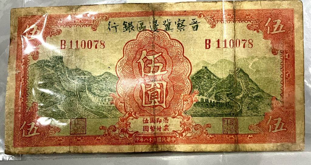 该藏品印制于民国二十八年,编号为:B110078号,上有“凭票即付 国币五元”字样。该版本的红色政权边区票在市场存量稀少,是研究边区经济活动的重要史料。